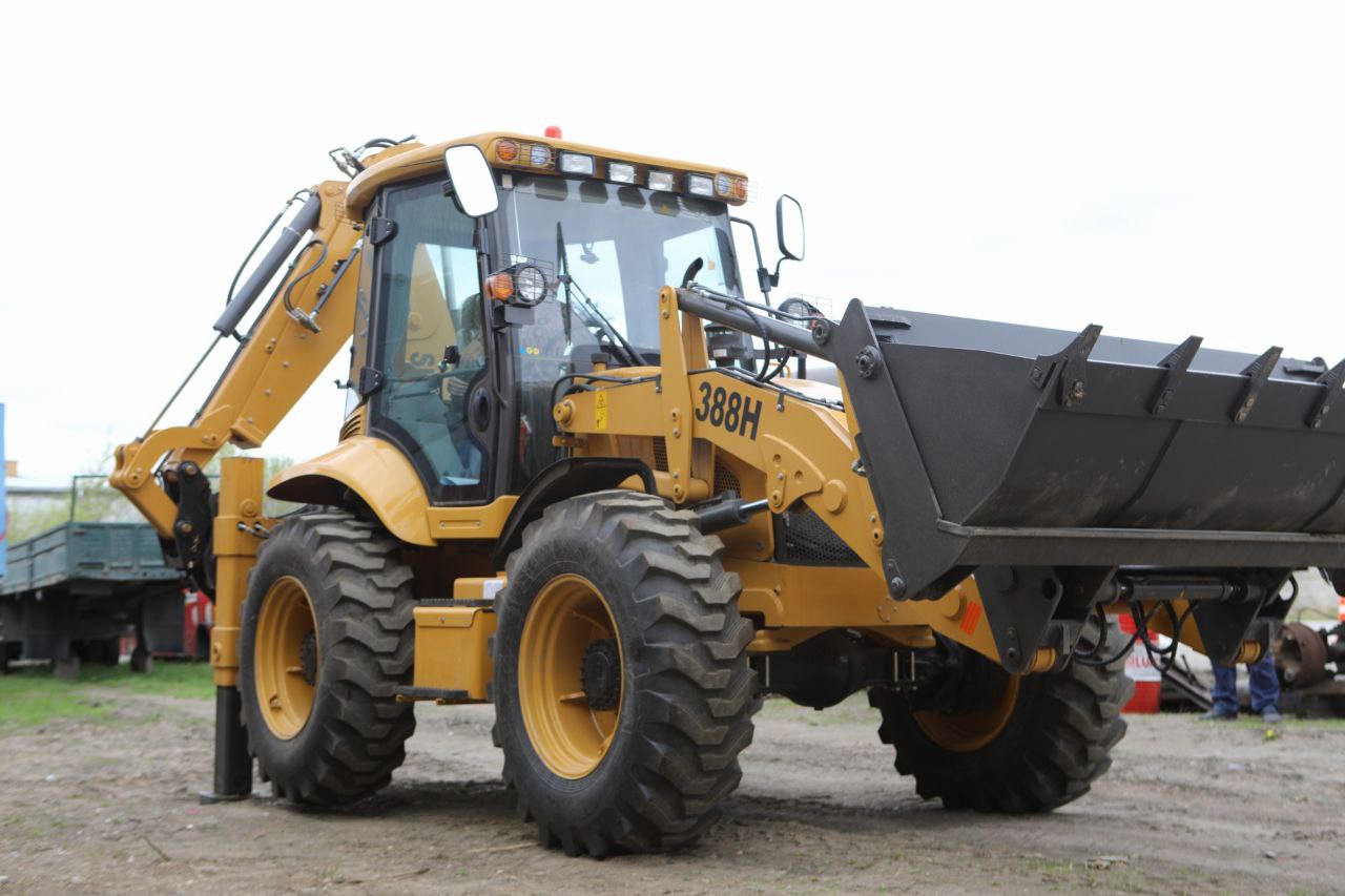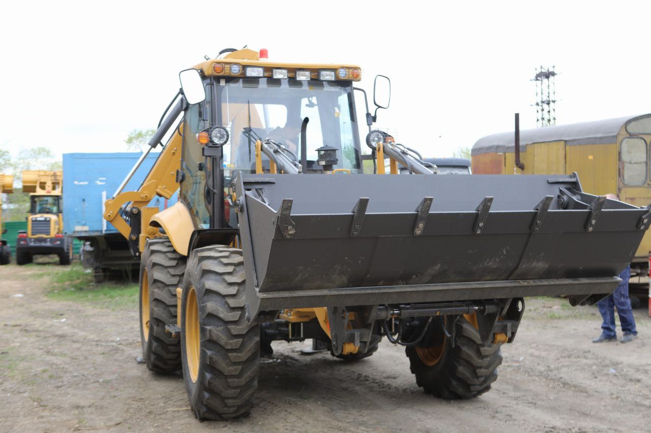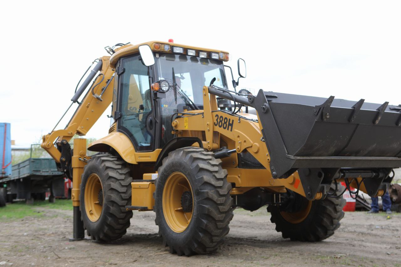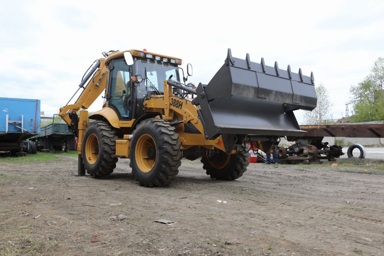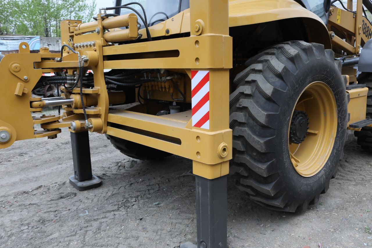 — Равноколесный экскаватор-погрузчик имеет прочную и устойчивую подвеску, что обеспечивает надежность и маневренность на различных типах поверхностей.